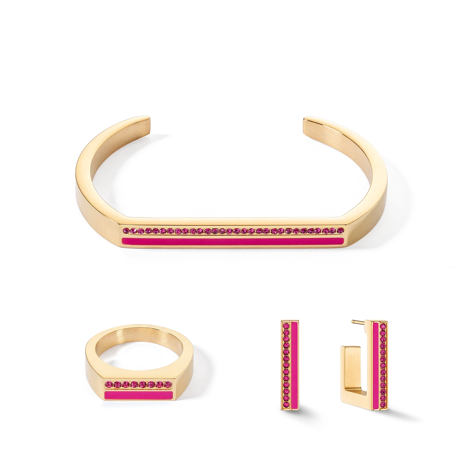 Êtes-vous prête pour une tendance dans les bijoux qui éveille vos sens ? Nos créoles carrées en acier inoxydable en or et rose vif éclatants : un incontournable absolu pour toutes celles qui aiment la mode. Grâce à leur fascinant mélange de matériaux composé de cristaux aux vives couleurs et de bandes colorées assorties, ces boucles d’oreilles confèreront à votre look fraîcheur et modernité. Également disponibles : un bracelet jonc et des bagues assortis.