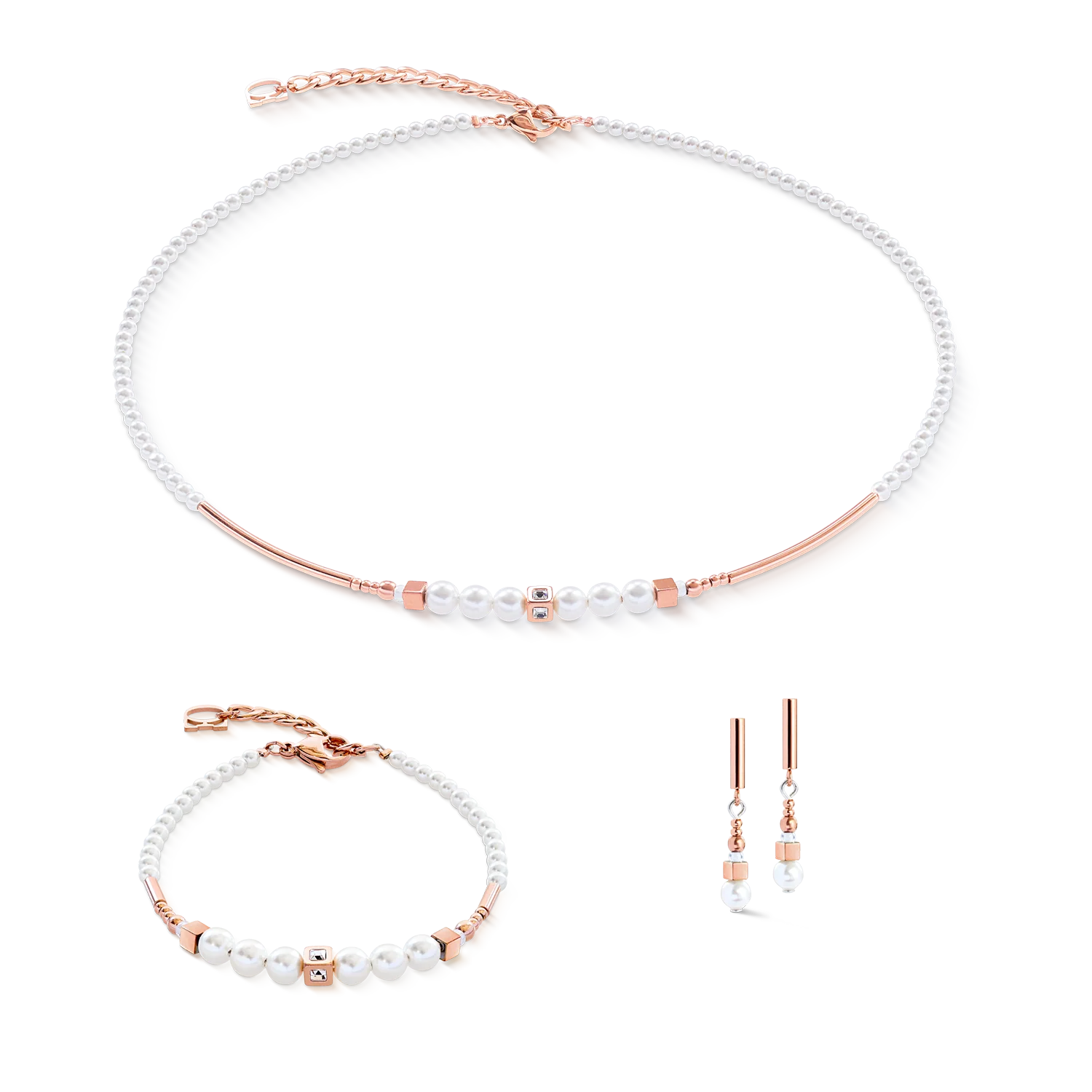 Élancées et élégantes – les boucles d’oreilles Shimmering Princess Pearls rosé-blanc reprennent le design du collier dans une silhouette verticale moderne. Une Crystal Pearl by Swarovski® lumineuse s’associe à des éléments en acier rosé.